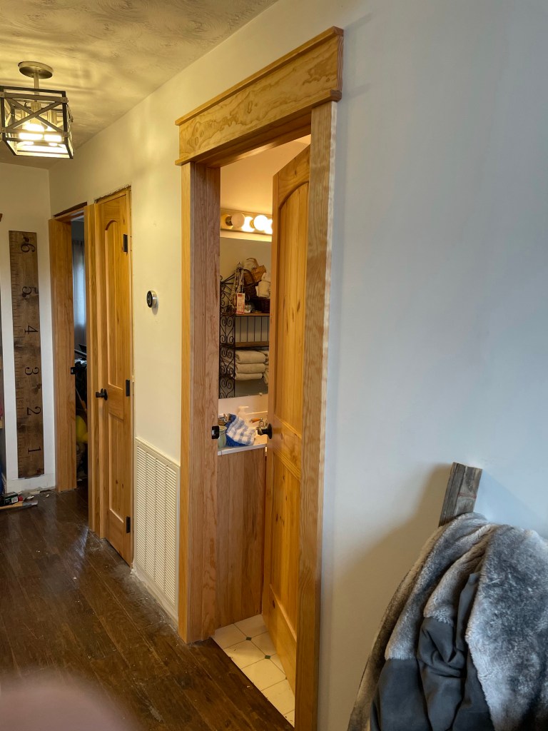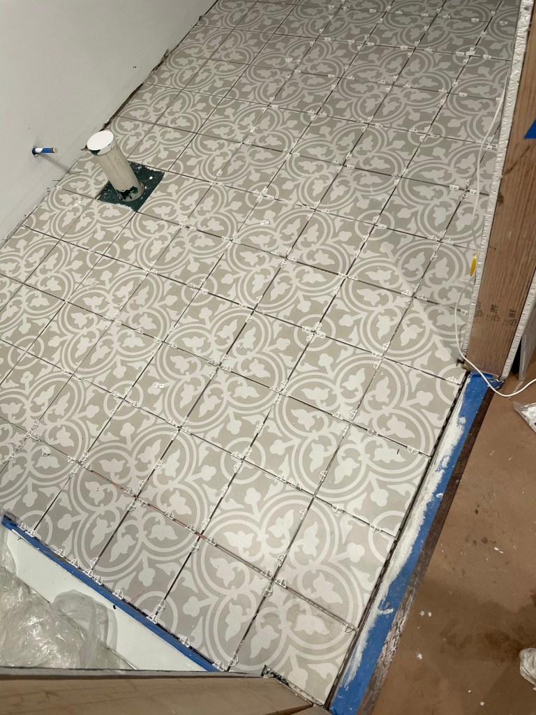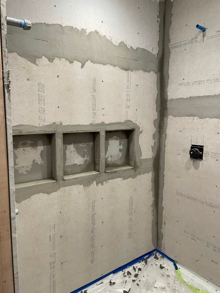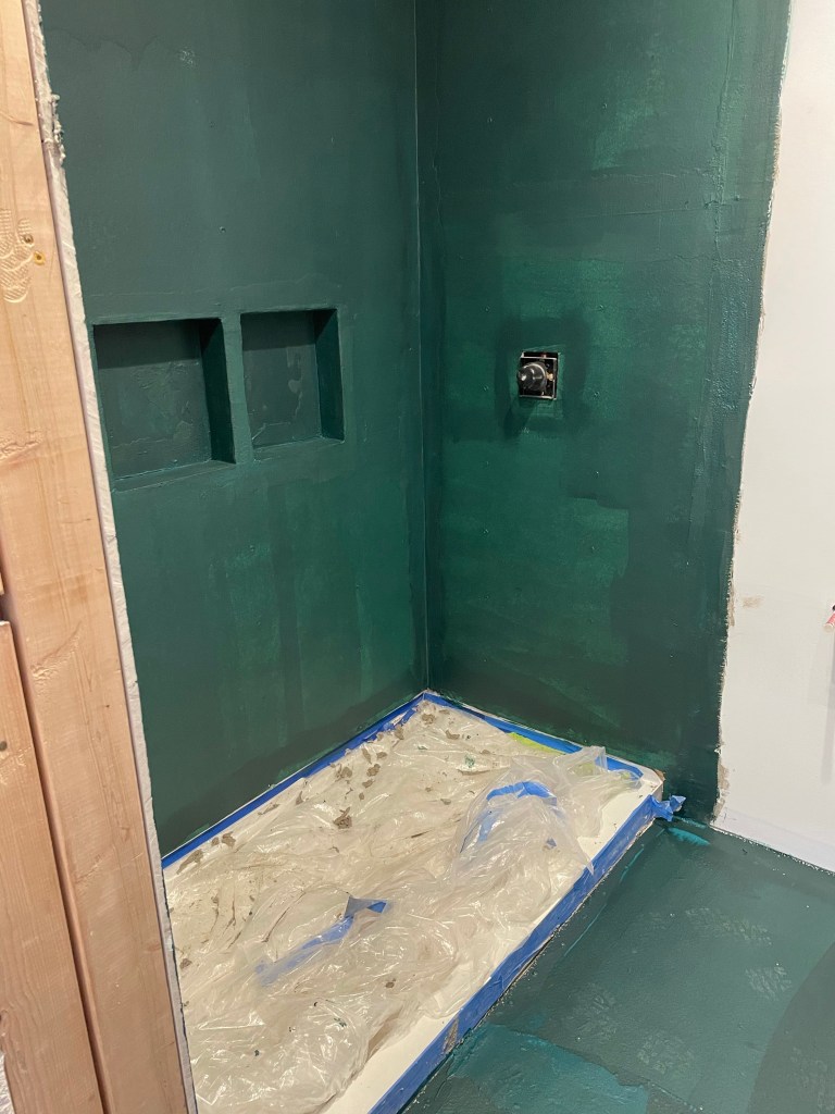 Trim is almost done upstairs. In the master bath we added the shower inserts, waterproofed, and got the tile floor in. We still need to grout the floor. Hopefully next week, the tile shower will be completed.