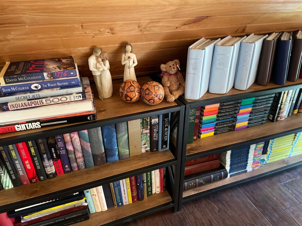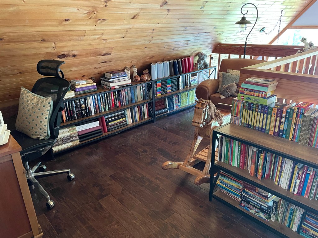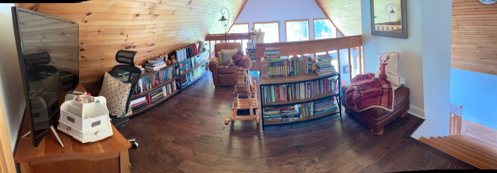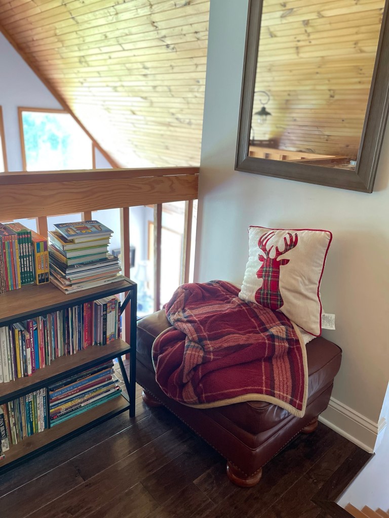 Ever since I was little I dreamed of having a library of my own. The one I have created isn’t quite as fancy as those dreams used to be. I always envisioned floor to ceiling shelves with ladders and widow walks, but this is cozy and just what we needed! In our past homes we have always had our bookshelves scattered throughout the house. Now that we have downsized, we had to figure out what to do with all of our books. The loft seemed like the perfect place to work in a little home library. The bookshelves work well with the sloped ceilings. We have a desk space to work from home and a cozy recliner to cuddle up and read a good book.