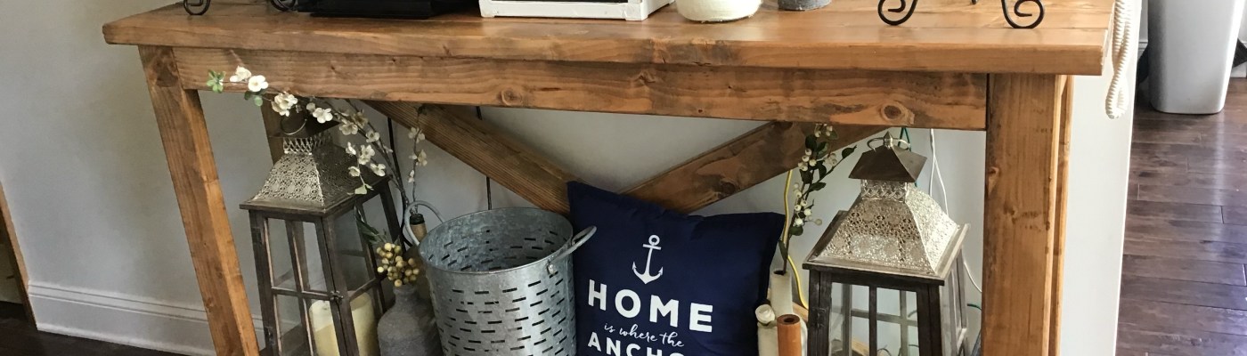 I have had several friends ask about the console table that my husband made for our narrow cabin hallway. If you are interested in creating a table of your own I will break down the process we went through. Please keep in mind we like to fly by the seat of our pants and are not professionals so follow our lead at your own peril.
